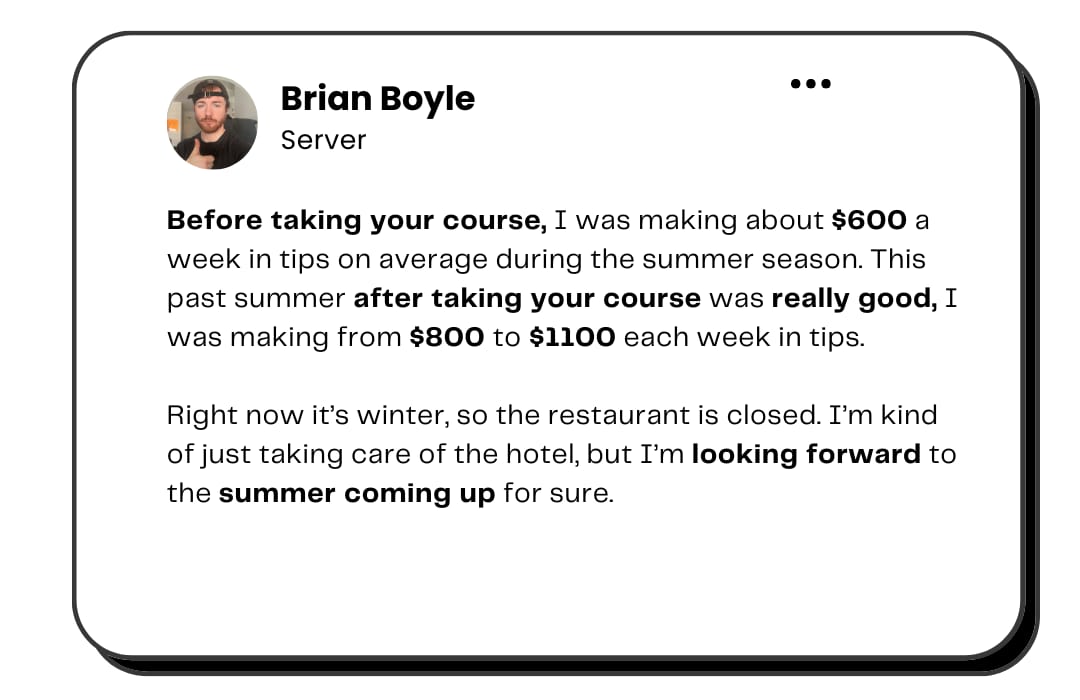 These are the same tactics we’ve used the last 2.5+ years to increase the income of dozens of restaurants and thousands of servers.