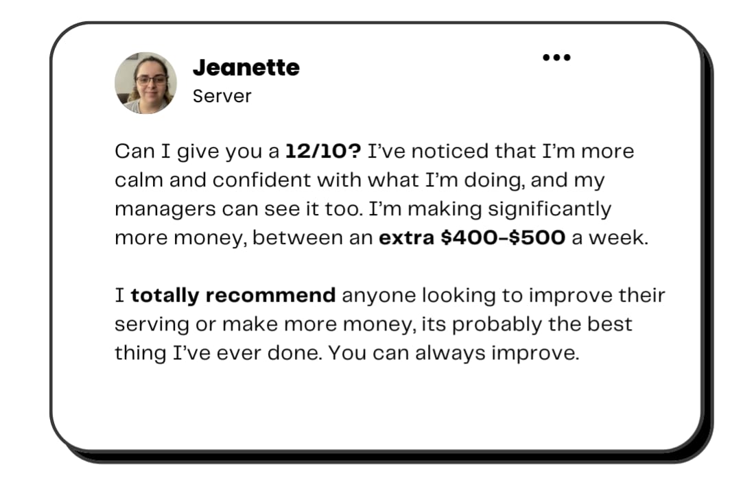 Whether you’ve just started serving and are looking to build a strong foundation of sales skills, or you’ve been serving for years but wish you could make more money, this course will get you there.