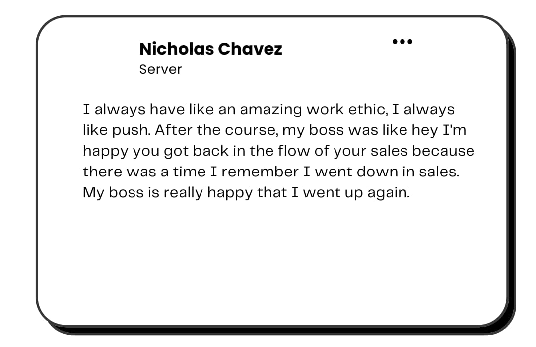 We have raised servers’ income by >20%, while working the same exact amount of shifts that they were before joining our course